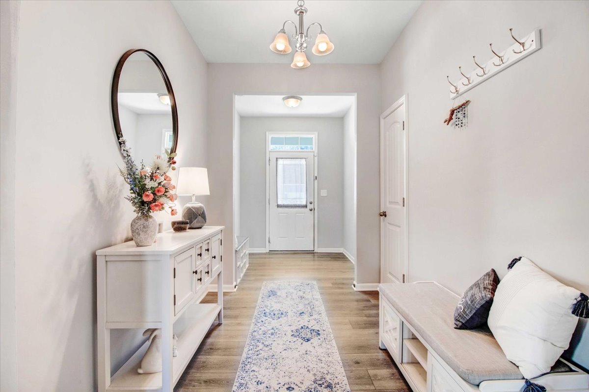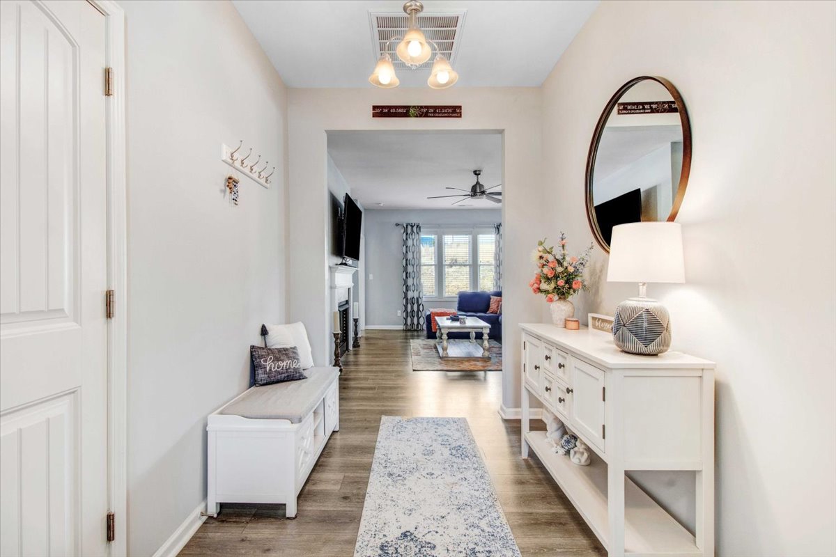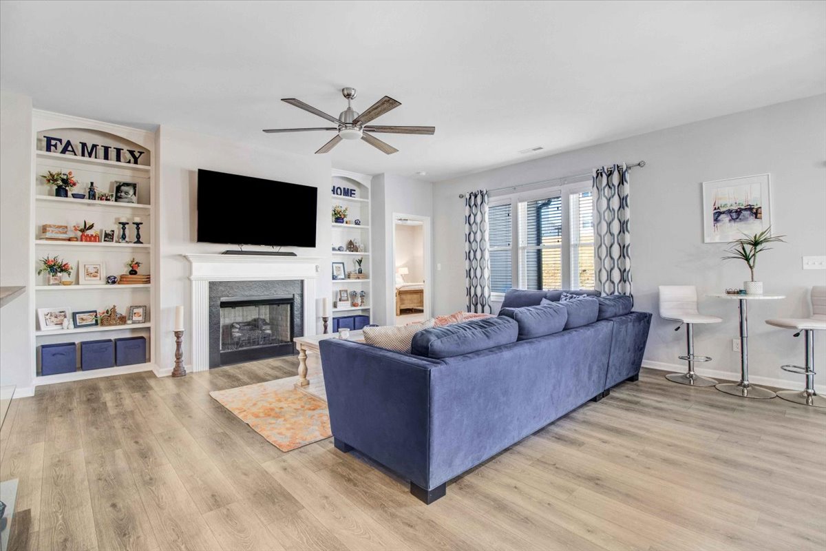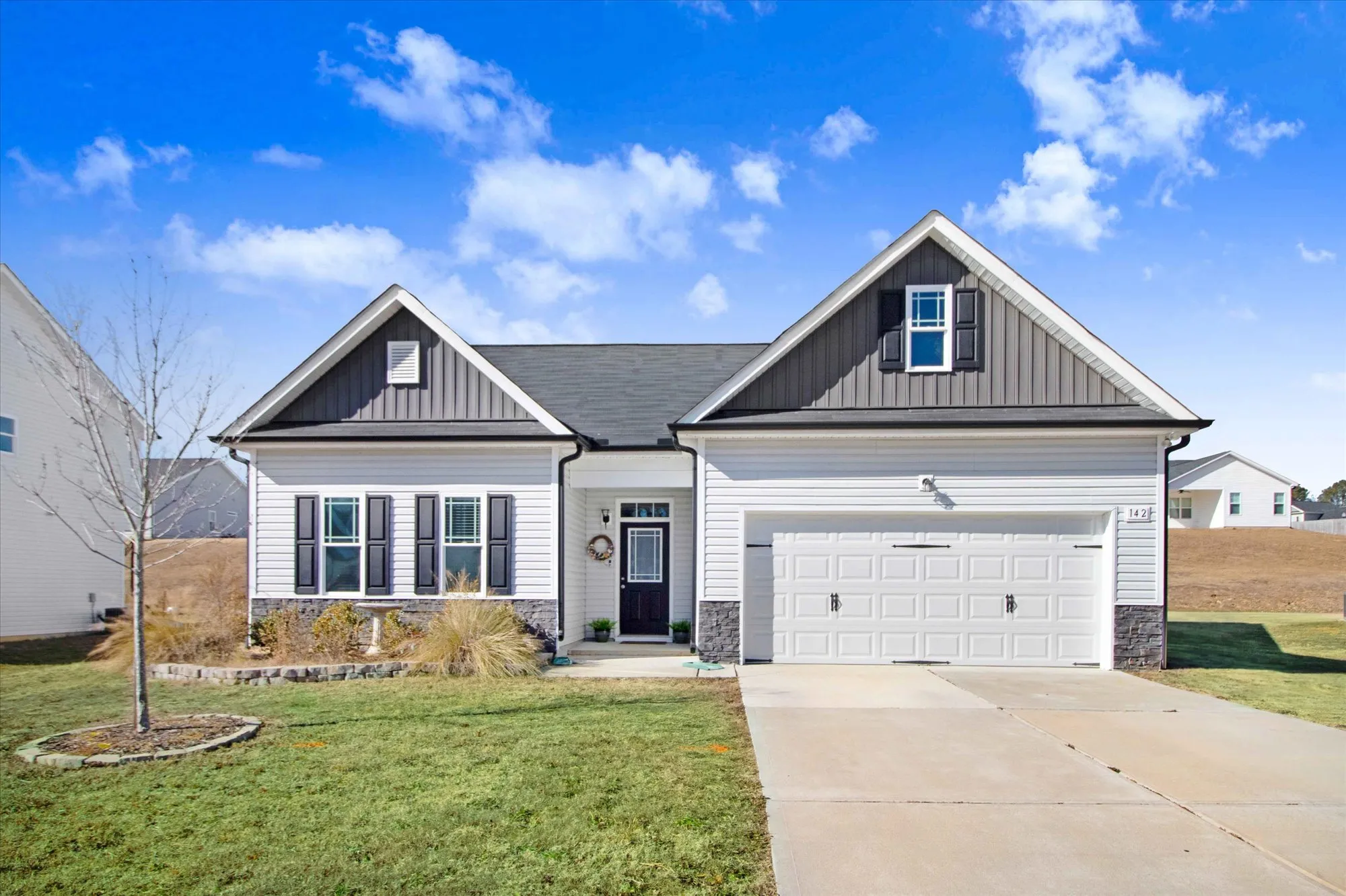 This beautiful Nicklaus ranch plan offers a perfect blend of comfort and style. The open-concept floor plan features 3 generously sized bedrooms and 2 bathrooms. The heart of the home is the stunning kitchen, boasting beautiful white cabinetry, gleaming quartz countertops, and stainless steel appliances. A large island provides ample workspace and seating. The adjacent family room invites relaxation with a cozy gas log fireplace and built-in bookshelves. The luxurious master suite is a true retreat, complete with a tray ceiling, upgraded ceiling fan, a spacious walk-in closet, and a 5ft shower. This home comes with a one year home warranty. This home is a must-see.